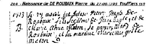 Il a épousé le sam 9 jan 1723 à Toufflers (59) Carette Marie Catherine, N° 265, Née le lun 13 jan 1698 à Toufflers (59). Décédée le mar 17 aoû 1756 à Toufflers (59). 10 enfants sont nés de cette union : 1. Deroubaix Jean Baptiste Joseph, Né le ven 20 aoû 1723 à Toufflers (59). Union le sam 11 oct 1749 à Toufflers (59) avec Cocheteux Catherine - Antoinette -. Union le mar 11 fév 1755 à Willems (59) avec Tricoit Marie Rose. Décédé le sam 11 jan 1806 à Bailleul (be). 2. Deroubaix André François, Né le lun 19 fév 1725 à Toufflers (59). Union le dim 4 fév 1748 à Toufflers (59) avec Leblanc Marie Joseph. 3. Deroubaix Pierre Philippe, Né le mer 30 oct 1726 à Toufflers (59). Union le mar 2 nov 1751 à Toufflers (59) avec Delerue Julienne Joseph. Union le mar 4 nov 1788 à Toufflers (59) avec Macou Catherine. Décédé le sam 5 avr 1800 à Lys-Lez-Lannoy (59). 4. Deroubaix Pierre Joseph, Né le lun 13 sep 1728 à Toufflers (59). Union le mar 4 nov 1755 à Toufflers (59) avec Crépin Marie Anne. Décédé le ven 16 mar 1798 à Toufflers (59). 5. Deroubaix Charles Joseph, Né le ven 29 avr 1729 à Toufflers (59). 6. Deroubaix Catherine Joseph, Née le sam 8 avr 1730 à Toufflers (59). 7. Deroubaix Marie Constance, Née le mar 1er juil 1732 à Toufflers (59). Décédée le sam 8 fév 1738 à Toufflers (59). 8. Deroubaix Charles Joseph, Né le jeu 29 avr 1734 à Toufflers (59). Union le mar 4 nov 1760 à Toufflers (59) avec Florent Jeanne. Décédé le mar 10 déc 1811 à Toufflers (59). 9. DeroubaixArchange Joseph, N° 132, Né le sam 11 aoû 1736 à Toufflers (59). Union le mar 21 mai 1765 à Toufflers (59) avec Duponchel Julie Joseph, N° 133. Décédé le jeu 30 aoû 1804 à Toufflers (59). 10. Deroubaix Jacques Joseph, Né le jeu 11 sep 1738 à Toufflers (59). Décédé le mar 8 juin 1751 à Toufflers (59). |